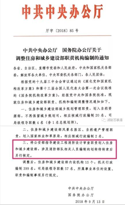 此前中央辦公廳曾正式發(fā)文,將公安部指導(dǎo)建設(shè)工程消防設(shè)計(jì)審查職責(zé)劃入住房和城鄉(xiāng)建設(shè)部,涉及消防部隊(duì)相關(guān)人員編制的劃轉(zhuǎn)待轉(zhuǎn)隸后另行核定。